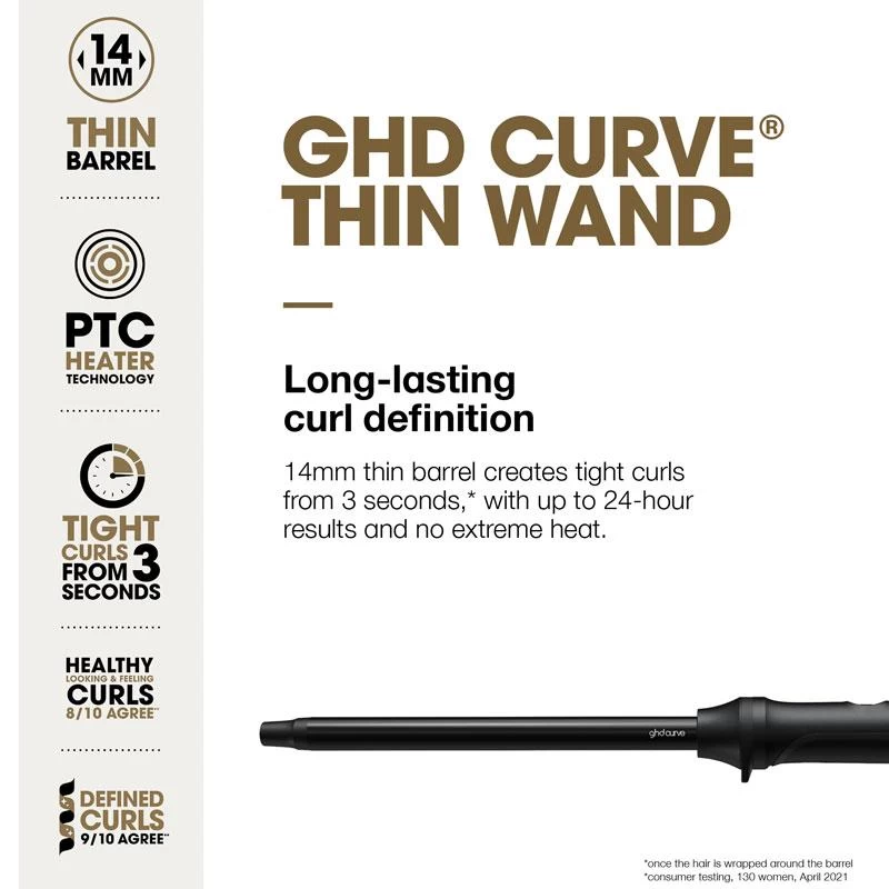 Designed with a seamless curling experience in mind, the ghd Curve Thin Wand Hair Curler creates long-lasting tight, defined and even curls quickly, with minimal effort, and no extreme heat. Ideal for all hair types, this styler works wonders in particular in long hair to transform straight hair to tight curls from root to tip. Ultra-lightweight, compact and ergonomic for added control and effortless curling at home, this professional curling wand with a 14mm thin barrel ensures defined, even and healthy-looking curls whatever your hair type and length. The 2.7m professional length swivel cord allows for greater styling freedom, allowing you to master the perfect style with ease. Featuring PTC heater technology with the optimum styling temperature of 185°C across the barrel, this innovative hair curler allows you to rapidly create tight curls from 3 seconds, achieving optimal ghd results and long-lasting curl definition with less damage. Hold the look for longer with ghd Curly Ever after and brush with the ghd Tail Comb.