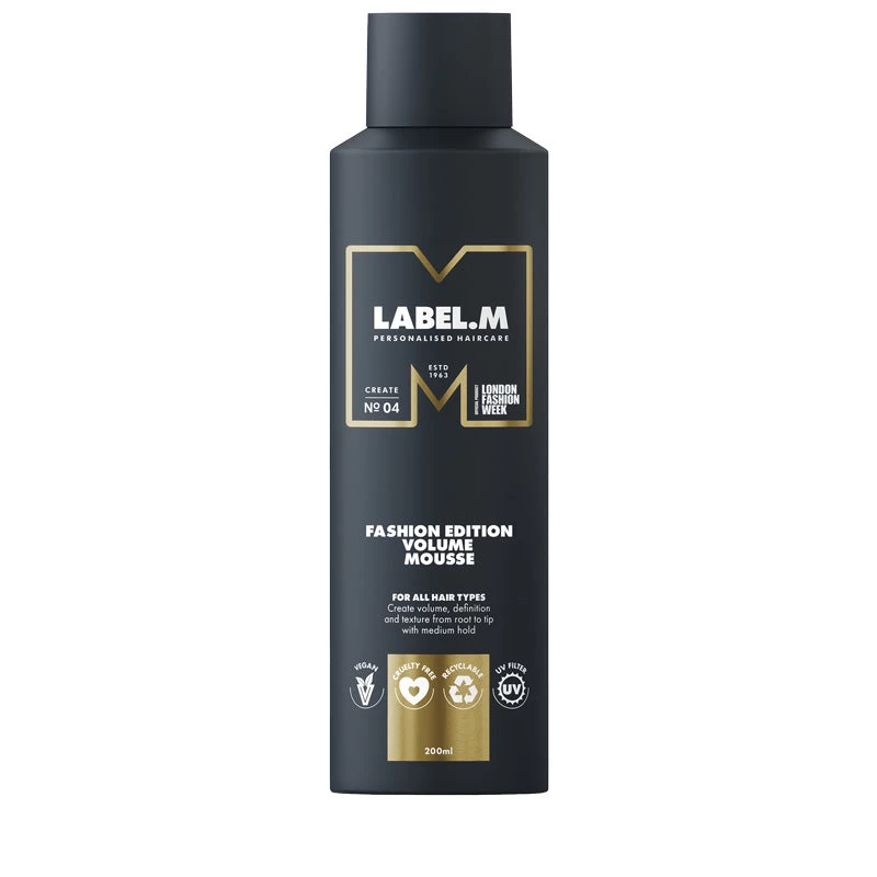 Create textured styles in seconds with the LABEL.M Fashion Edition Volume Mousse. The unique spray application gives hair enviable volume and body, while protecting against UV rays and colour fade with the added Enviroshield Complex. Enjoy medium hold and a healthy looking finish with flyaway control from the anti-static properties within this innovative spray. Ideal for all hair types.