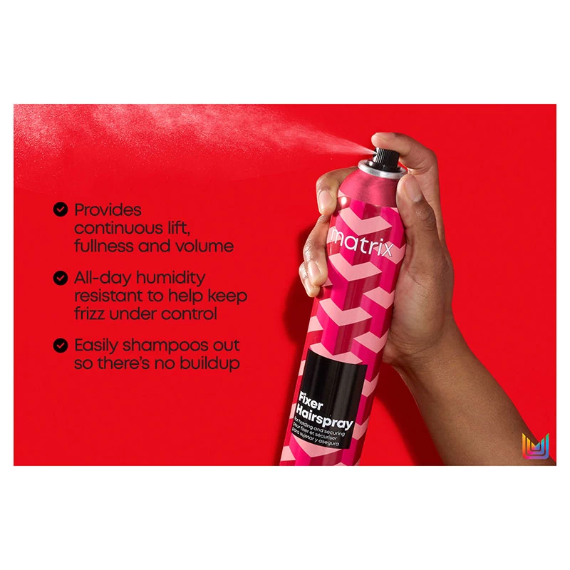 The Matrix Fixer Hairspray offers a flexible, firm hold without any stiffness. Providing hair with reliable lift, fullness and added shine, this innovative styling spray will ensure your style lasts. Enhanced with all-day humidity resistance, this frizz-fighting hairspray is perfect for all hair types and lengths and will lock your style into place.