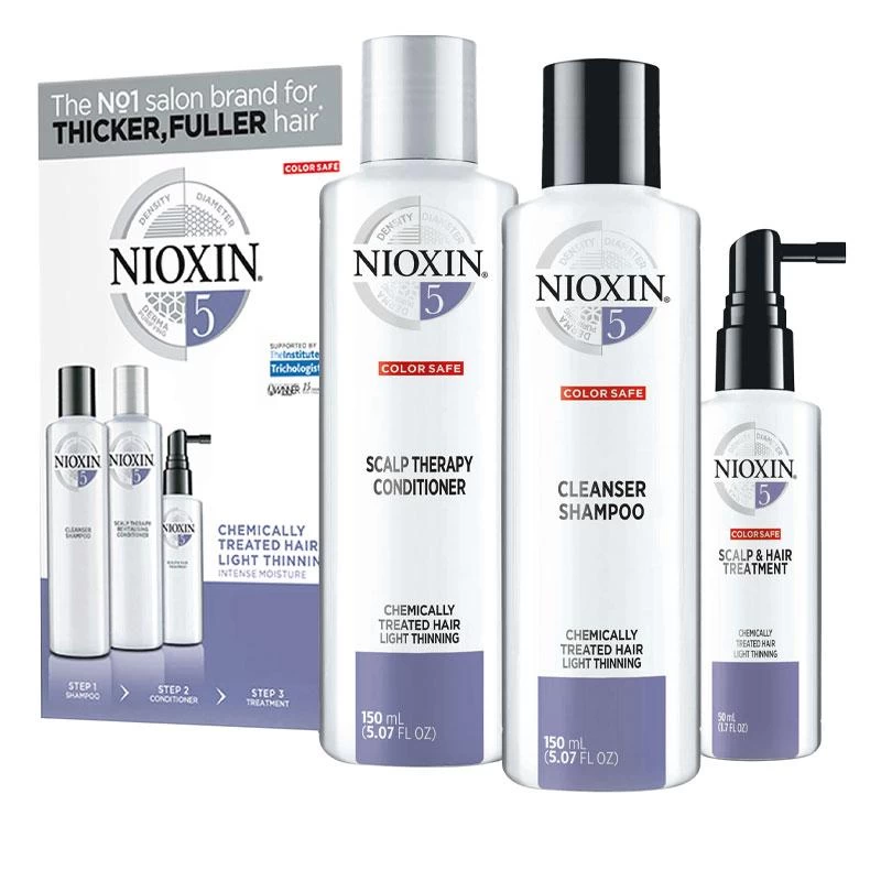 The Nioxin 3D Care Trial Kit System 5 (for chemically-treated hair with light thinning) includes:
